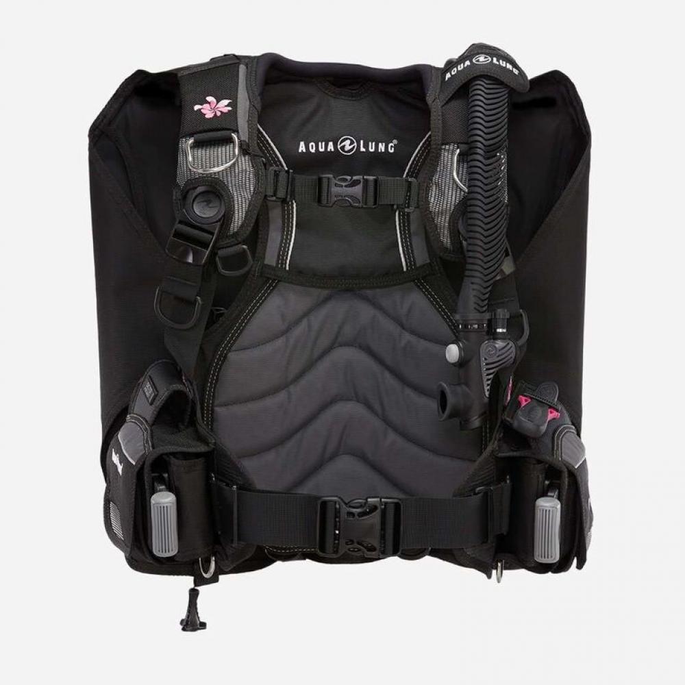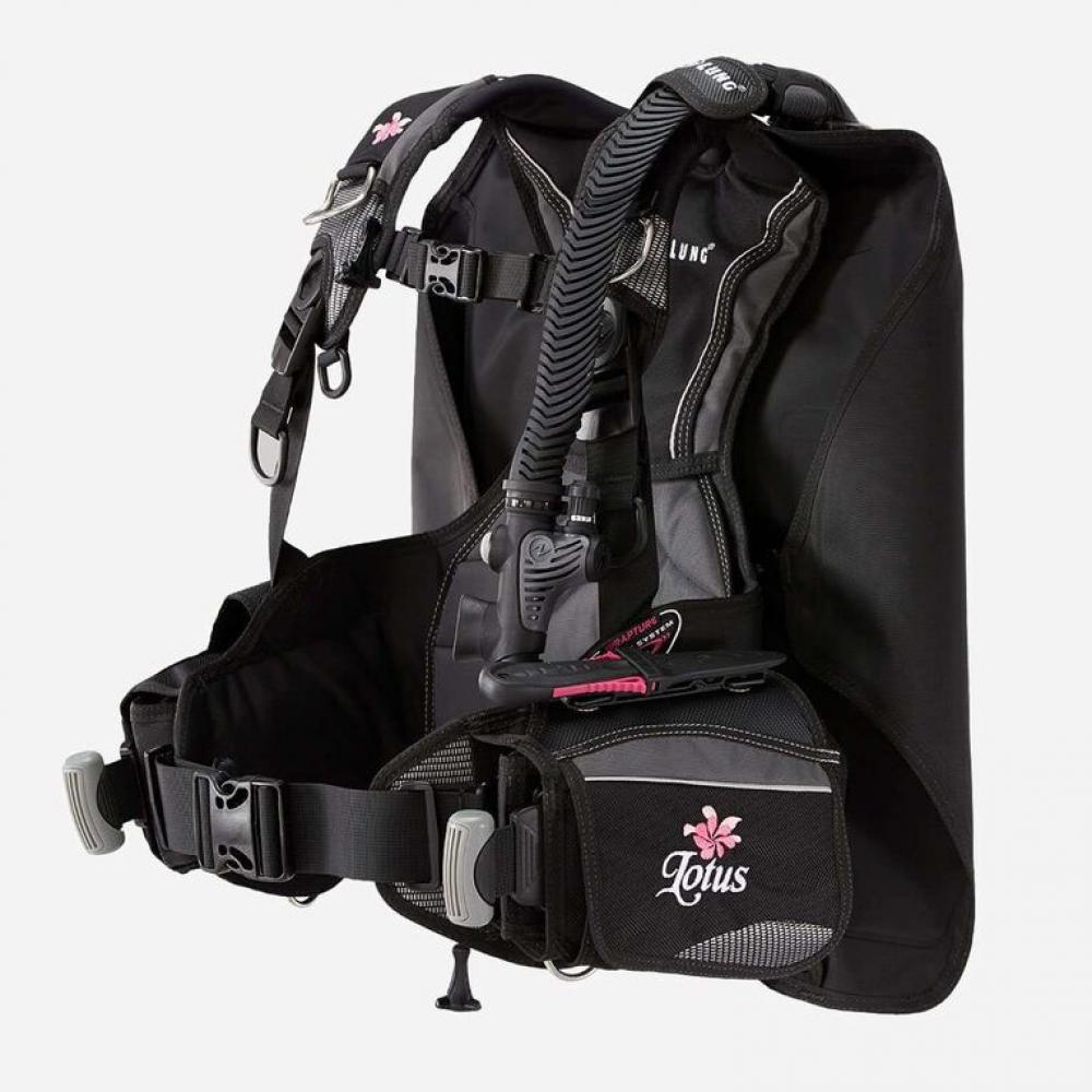 Aqualung Lotus is a back-inflation style BC designed specifically for women and incorporates Aqua Lung's integrated Wrapture Harness System. With the Lotus, the Wrapture Harness System hugs the contours of the female body with specially curved shoulder straps and side lobes that provide better fit. Integrated weights are held securely in place with the SureLock II mechanical weight system. Wrapture Harness System (pat. pend.) f Using patented swivel shoulder buckles and a proprietary, ultra-thin back plate, the Wrapture provides unsurpassed comfort and stability. Wrapture prevents the BC from "riding-up" on the surface. Out of the water, the Wrapture keeps the cylinder close to your center of gravity and transfers the weight to your hips. The result is the ability to stand up straight with a cylinder that is perfectly vertical. SureLock II Mechanical Weight Release System (patented) f allows you to easily insert the weight pouch and an audible "click" lets you know the weights are secure in the BC. Once engaged, the weights can be released with a firm pull the handle.