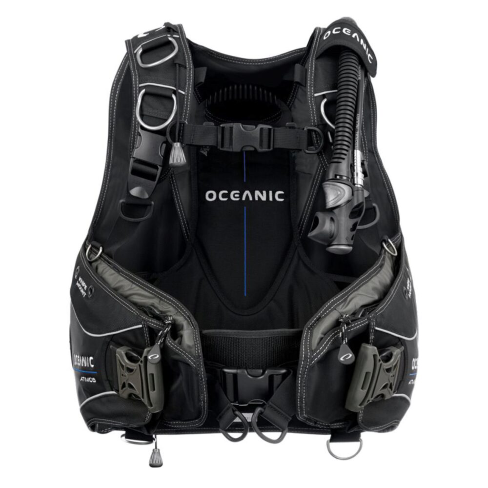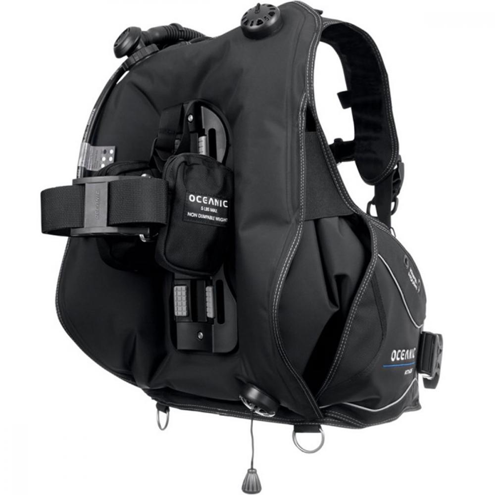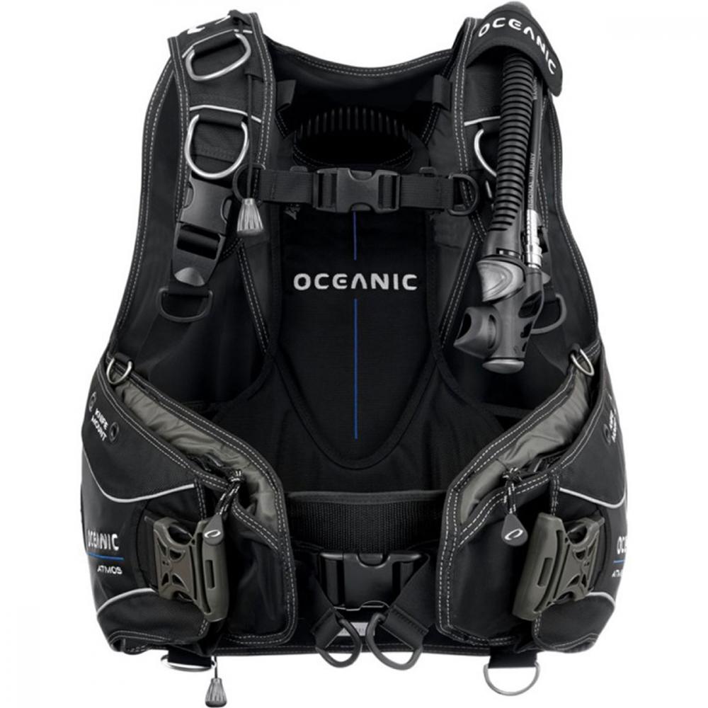 Oceanic Atmos is a durably-constructed, full-featured hybrid air-cell BC. Unique, hybrid rear-inflation bladder enables air to shift," which provides maximum amount of lift and keeps you properly orientated on or below the surface. BC has 20 lbs. (9 kg) of integrated releasable weight in the Pinch & Release System and 10 lbs. (4.5 kg) non-releasable trim weight capacity. Padded back-plate features an extended lumbar support to transfer tank weight onto hips, relieving shoulder stress. Three (3) over pressure relief/pull dump valves optimize buoyancy control and trim while diving. Easy inflation/deflation with the Oceanic's versatile power inflator equipped with an internal pull dump cable attached to one of the 3 overpressure/dump valves. The BCD comes with a 3/8" threaded low pressure quick-disconnect hose.